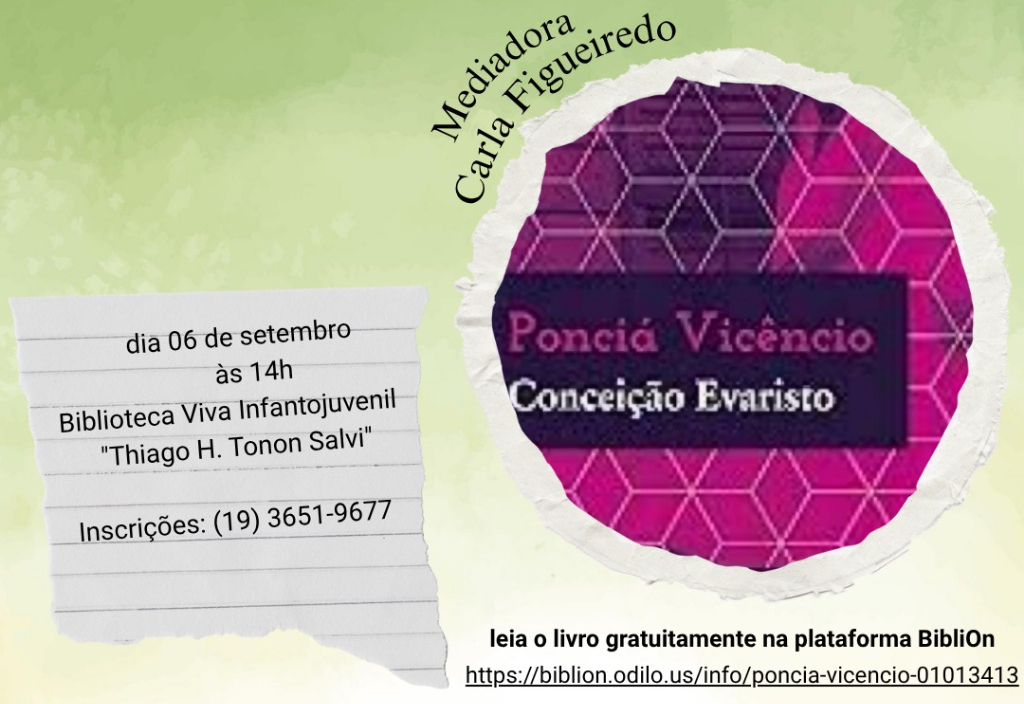 Para o nosso próximo encontro selecionamos o livro "Ponciá Vicêncio" de Conceição Evaristo, que já está disponível gratuitamente na plataforma Biblion. Acesse:https://biblion.odilo.us/info/poncia-vicencio-01013413