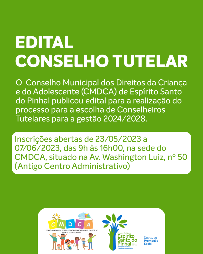 O Conselho Municipal dos Direitos da Criança e do Adolescente (CMDCA) de Espírito Santo do Pinhal publicou edital para a realização do processo para a escolha de Conselheiros Tutelares para a gestão 2024/2028.