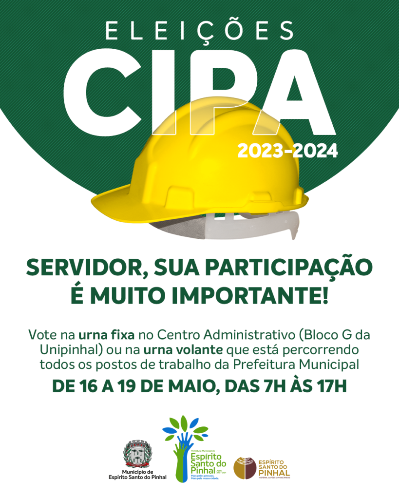 Acontece, de 16 a 19 de Maio, das 7 às 17h, a eleição da CIPA - Comissão Interna de Prevenção de Acidentes - Gestão 2023/2024, com urna fixa no Centro Administrativo (Bloco G da Unipinhal) e uma urna volante que percorrerá todos os postos de trabalho do Município.