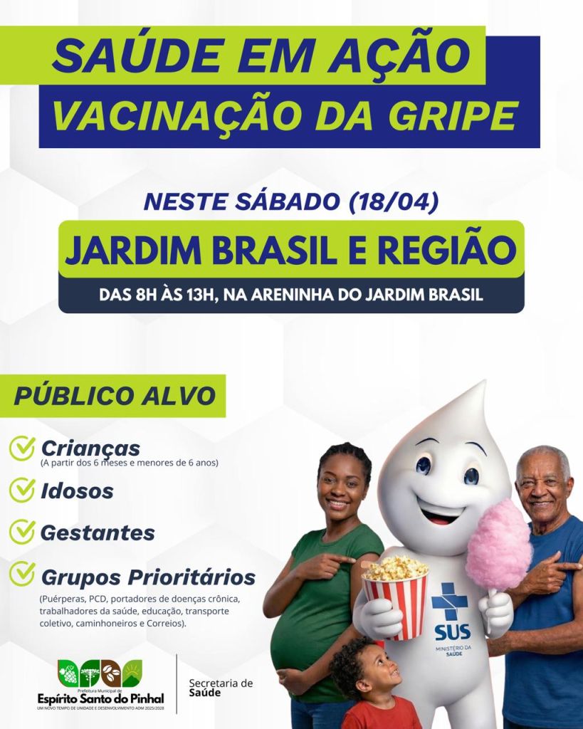 A Prefeitura Municipal de Espírito Santo do Pinhal, por intermédio da Secretaria de Saúde, realizará neste sábado, 18 de abril, a campanha "Saúde em Ação – Vacinação da Gripe". A força-tarefa tem como objetivo facilitar o acesso da população à imunização e ocorrerá na Areninha do Jardim Brasil, prestando atendimento aos moradores do bairro e região adjacente.