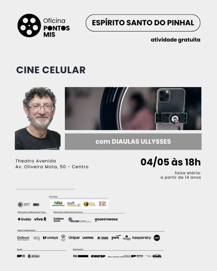 O Município de Espírito Santo do Pinhal, por meio de sua Diretoria de Cultura, realiza no próximo dia 4 de maio (segunda-feira), às 18h, a oficina gratuita "Cine Celular". A iniciativa, que ocorre no tradicional Theatro Avenida, é fruto de uma parceria estratégica com o programa Pontos MIS, do Museu da Imagem e do Som de São Paulo, e visa fomentar a produção cultural local através de ferramentas acessíveis.