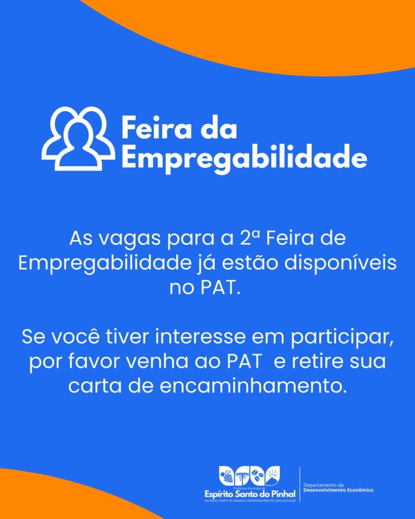 O cidadão poderá buscar os serviços on-line para atendimentos: Carteira de trabalho digital, seguro-desemprego e busca de empregos e vagas. O PAT de Espírito Santo do Pinhal não se responsabiliza pela veracidade de informações em sites não oficiais que divulgam as vagas de emprego extraídas desta página. Mantenha o seu cadastro atualizado no programa Mais Emprego, compareça ao PAT munido do seu CPF e RG. O PAT de Espírito Santo do Pinhal fica localizado no "Agiliza Pinhal "