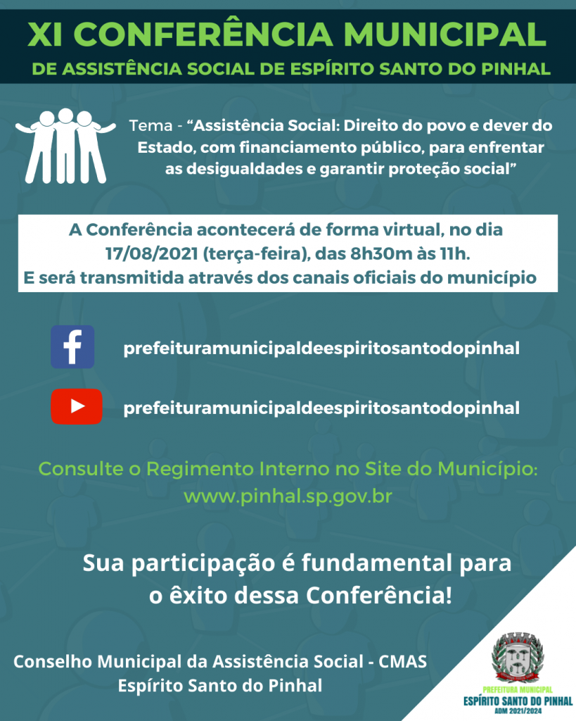 A Prefeitura Municipal de Espírito Santo do Pinhal, o Departamento de Promoção Social e o Conselho Municipal da Assistência Social, têm a honra de convidar a população, para participar virtualmente da XI Conferência Municipal da Assistência Social, no dia 17/08/2021 (terça-feira), das 8h30m às 11h, através dos Canais Oficiais do Município: