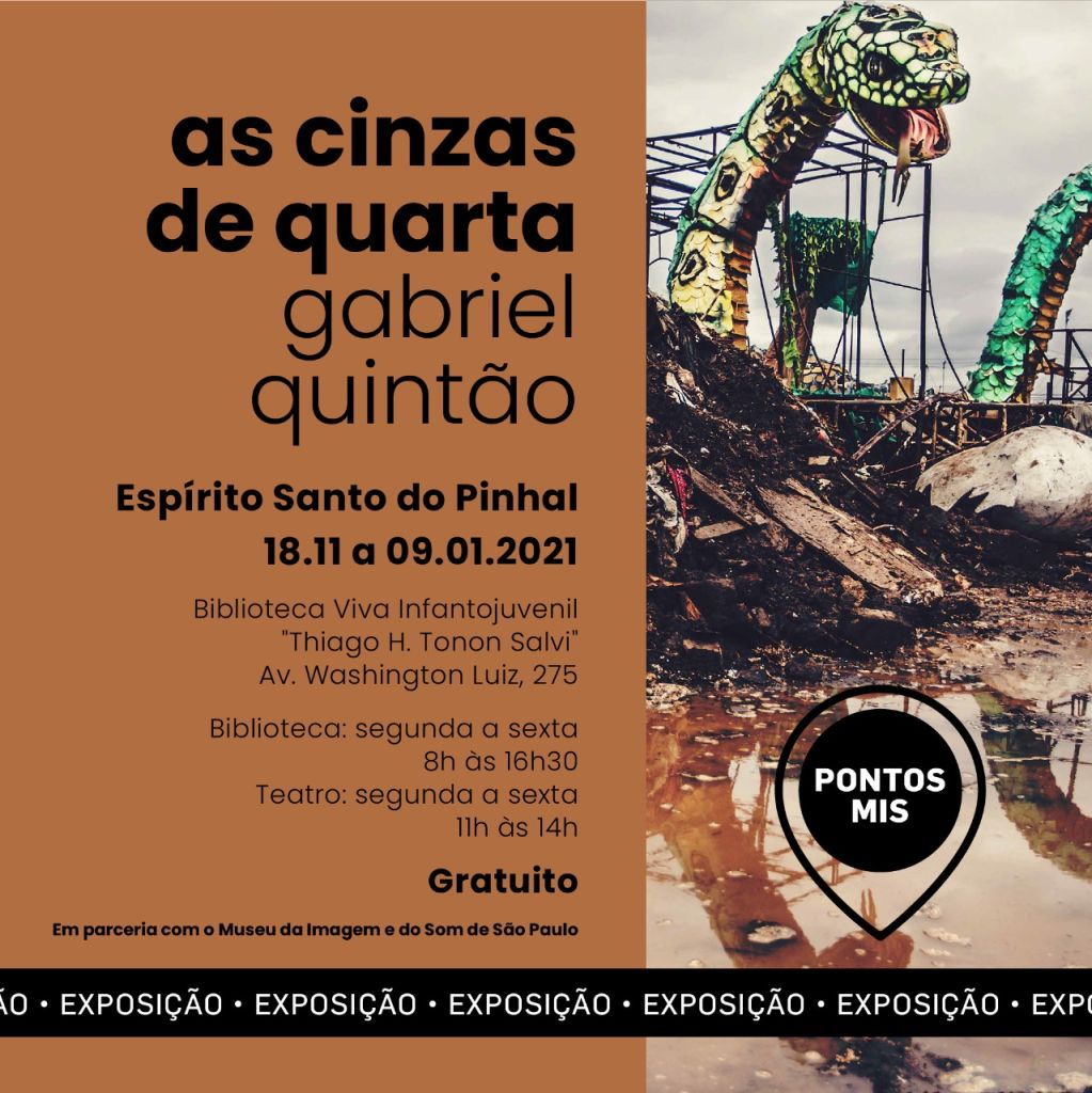 O Programa de difusão cultural do Museu da Imagem e do Som de São Paulo, Pontos MIS, realiza a exposição "As cinzas de quarta" em parceria com a prefeitura de Espírito Santo do Pinhal. As imagens feitas por Gabriel Quintão na série "As cinzas da quarta" retratam a fragilidade da felicidade do Carnaval e, sobretudo, o esforço dos foliões em sustentar algo nascido para morrer após 80 minutos de uso. Captadas em um terreno da zona norte de São Paulo, onde as escolas de samba abandonam suas criações depois do desfile, as cenas incentivam uma comparação entre a alegria do Carnaval e a vida real das pessoas que fazem o espetáculo acontecer. Elas também nos fazem pensar que o pós-Carnaval está mais ligado à realidade dura dos foliões do que ao próprio espetáculo em si. É quando o luxo perde o brilho e o orgulho de fazer parte da maior festa popular do país é abandonado ao ar livre. Horário de funcionamento: Segunda à Sexta das 08h às 16:30h na Biblioteca Viva e das 11h às 14h no Theatro Avenida.