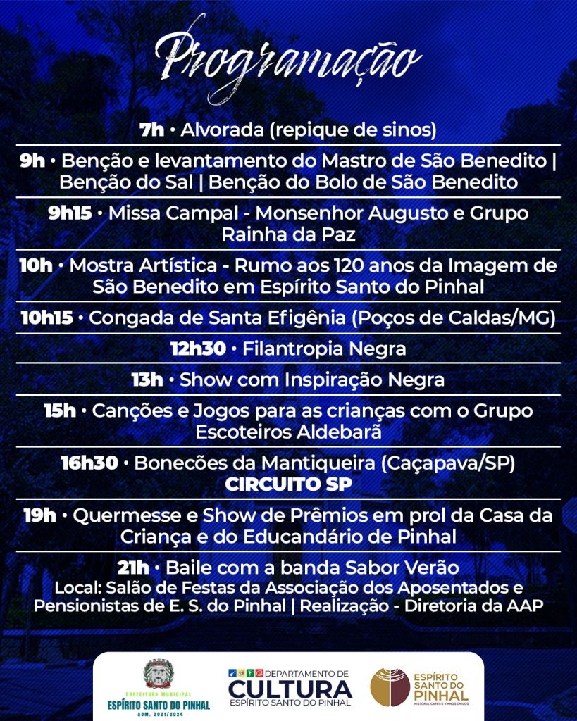 Venha para a Festa de São Benedito neste Sábado, dia 13 de agosto, a partir das 9h, na Praça São Benedito.