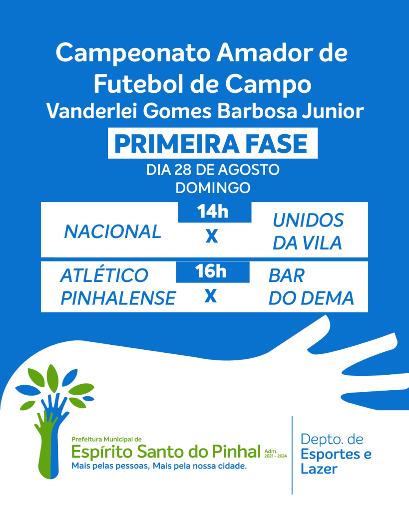 As 14h temos o primeiro jogo entre Nacional x Unidos Da Vila, logo depois, as 16h outro jogo entre Atlético Pinhalense x Bar do Dema.