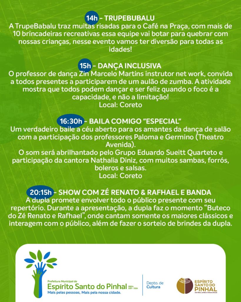 Dia 28/08, Domingo, acontecerá o Café na Praça, com atrações para levar diversão, entretenimento e cultura aos pinhalenses.