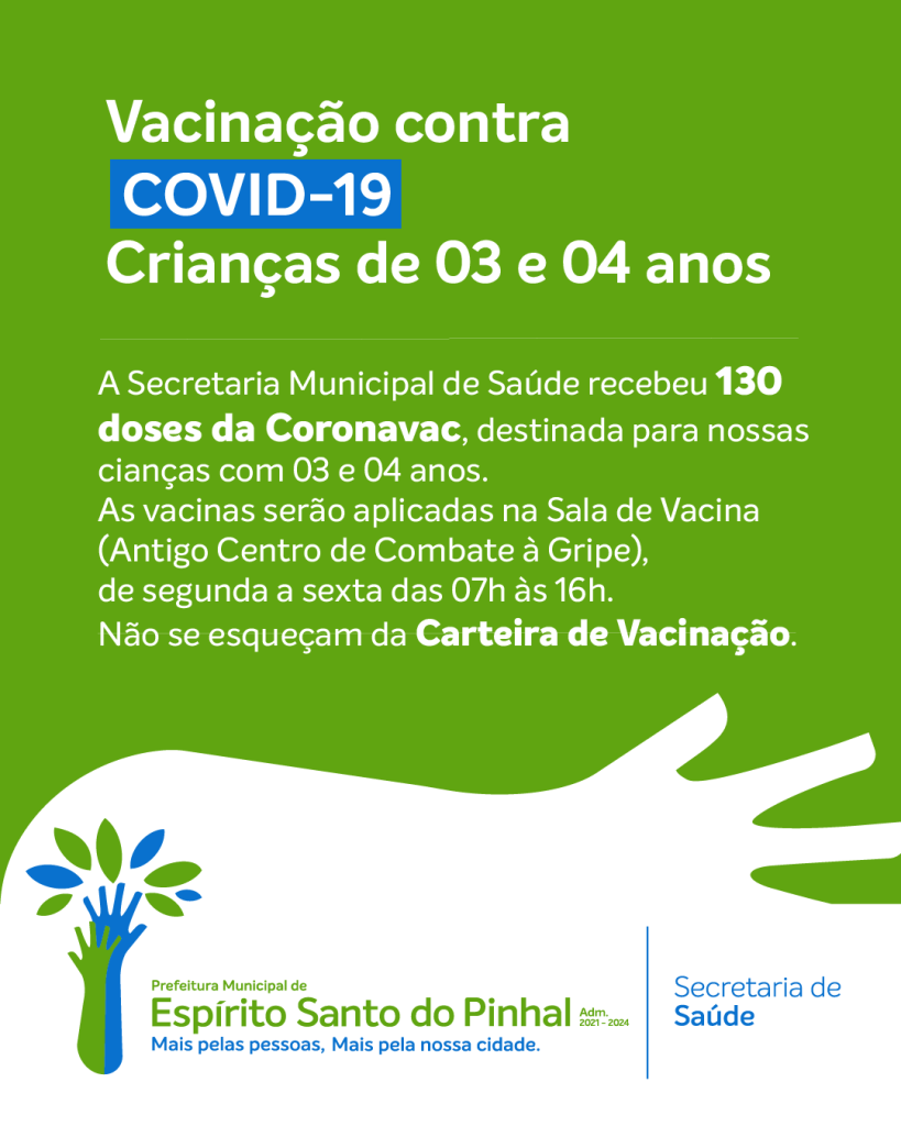 A Prefeitura Municipal, através da Secretaria Municipal de Saúde, informa que recebeu 130 doses da Coronavac para serem aplicadas em crianças de 03 e 04 anos.