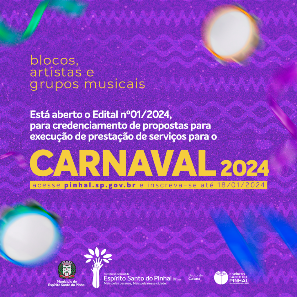 O Edital n° 01/2024 - Carnaval 2024 do Município de Espírito Santo do Pinhal objetiva selecionar artistas para tocarem no período de Carnaval, entre os dias 10, 11 e 13 de fevereiro de 2024.