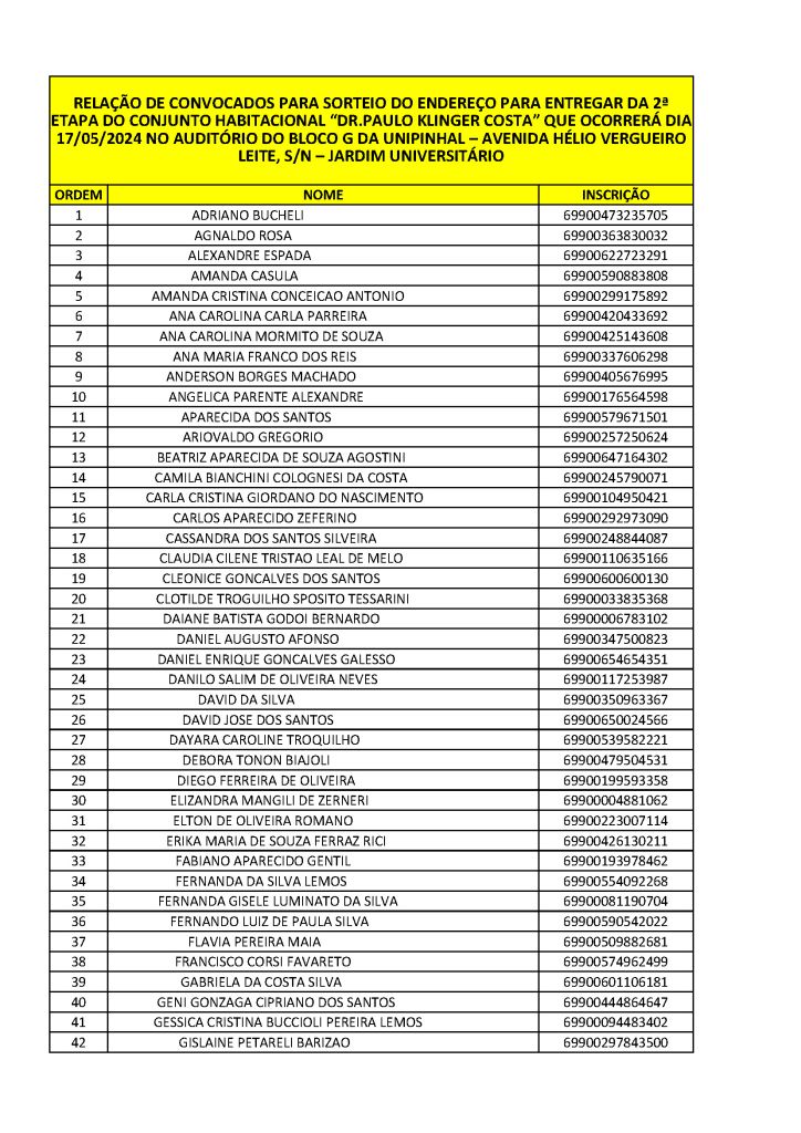 A CDHU está convocando famílias para o sorteio dos endereços da 2ª etapa das casas do Conjunto Habitacional Paulo Klinger Costa nesta sexta-feira, 17/05, às 14h, no auditório do Bloco G da Unipinhal. Confira abaixo o nome dos convocados ou clique aqui.