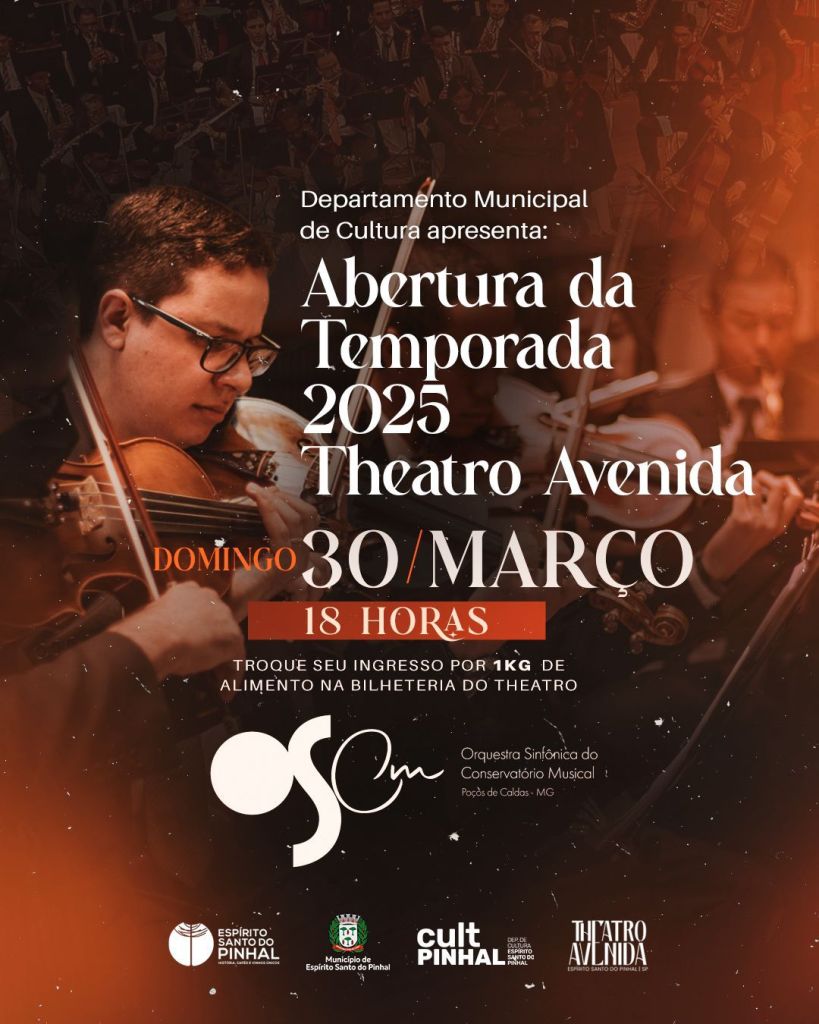 No próximo Domingo, 30 de Março às 18h vamos realizar o Concerto de Abertura da Temporada 2025 do Theatro Avenida com a Orquestra Sinfônica do Conservatório Musical de Poços de Caldas - MG.