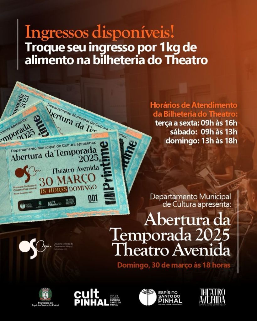 Os ingressos podem ser trocado por 1kg de alimento não perecível, de segunda à sexta das 9h às 16h na bilheteria do Theatro Avenida, ou no sábado das 9h às 13 e domingo à partir das 13h.