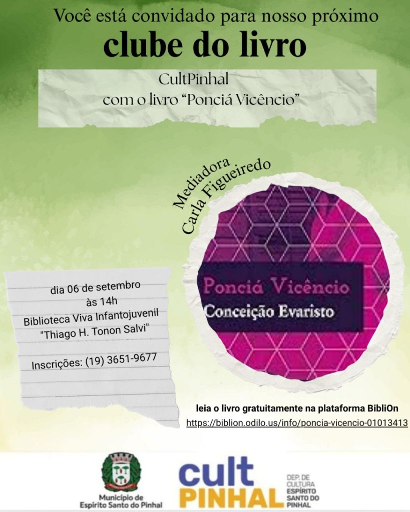 Para o nosso próximo encontro selecionamos o livro "Ponciá Vicêncio" de Conceição Evaristo, que já está disponível gratuitamente na plataforma Biblion. Acesse:https://biblion.odilo.us/info/poncia-vicencio-01013413
