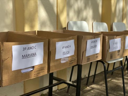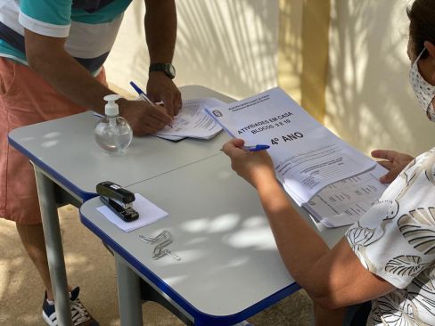 Para que fosse possível retirar o novo material, os pais ou responsáveis pelos alunos devolveram os cadernos que foram entregues nos dias 29 e 30 de junho para que os professores pudessem iniciar o processo de correção.