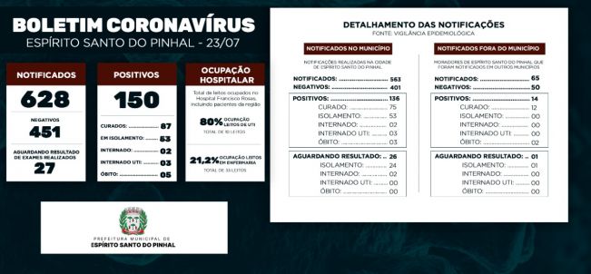 A Prefeitura de Espírito Santo do Pinhal informa que o Boletim Epidemiológico divulga o índice de ocupação hospitalar, de acordo com informações do Hospital Francisco Rosas, levando em consideração a totalidade de pacientes internados do município e demais cidades. Nesta quinta-feira, 23, foram registrados oito pacientes com resultados positivos para COVID-19 e outros quatro foram testados negativos. Do total de positivos desde o início da pandemia, cerca de 60% já se recuperaram da doença. Confira o detalhamento: