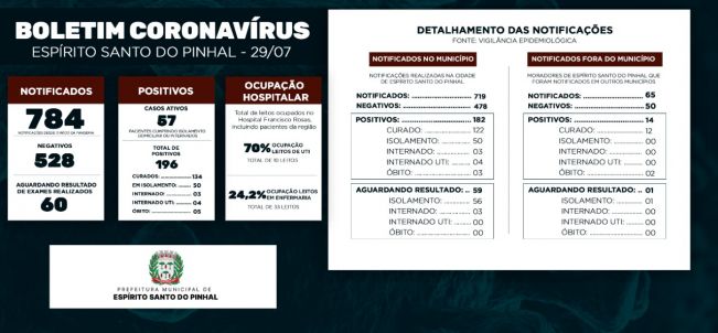 A Prefeitura de Espírito Santo do Pinhal informa que o Boletim Epidemiológico divulga o índice de ocupação hospitalar, de acordo com informações do Hospital Francisco Rosas, levando em consideração a totalidade de pacientes internados do município e demais cidades. Nesta quarta-feira, 29,foram registrados 22 pacientes com resultados positivos para COVID-19 e outros 22 foram testados negativos. De acordo com a Vigilância Epidemiológica, o resultado refere-se ao acumulado de exames realizados nas últimas semanas, além daqueles realizados em laboratórios particulares, que possuem notificação compulsória. Confira o detalhamento:
