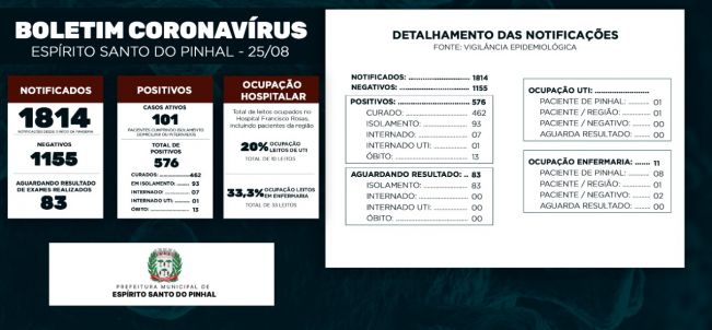 Nesta terça-feira, 25, a taxa de ocupação da UTI de Espírito Santo do Pinhal registrou nova queda, atingindo 20% dos leitos disponíveis (total de 10). A Vigilância Epidemiológica recebeu os resultados de 93 exames, sendo 63 negativos e outros 30 testaram positivo para coronavírus. Houve a confirmação de dois óbitos: um ocorrido em São João da Boa Vista no dia 06/08 (paciente com 70 anos que apresentava comorbidades – diabetes) e outro em Espírito Santo do Pinhal no dia 23/08 (paciente com 78 anos com comorbidades - diabetes e hipertensão). O índice de testagem no município está em 40,92 para cada mil habitantes, uma das maiores médias de toda a região.