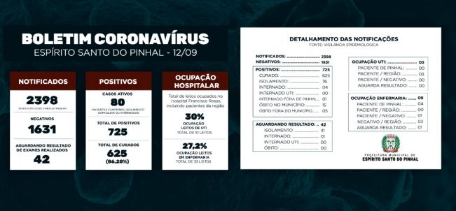 Neste sábado, 12, a ocupação da UTI está em 30%, sendo todos os pacientes moradores de municípios da região. Já a ocupação da enfermaria é de 27,2%. A Vigilância Epidemiológica recebeu os resultados de 20 exames negativos e 3 positivos. O número de casos ativos é de 80 no município, que são pacientes positivos que estão cumprindo quarentena ou estão internados por conta da COVID-19. Atualmente o índice de testagem está em 54,09 para cada mil habitantes, uma das maiores médias de toda a região.