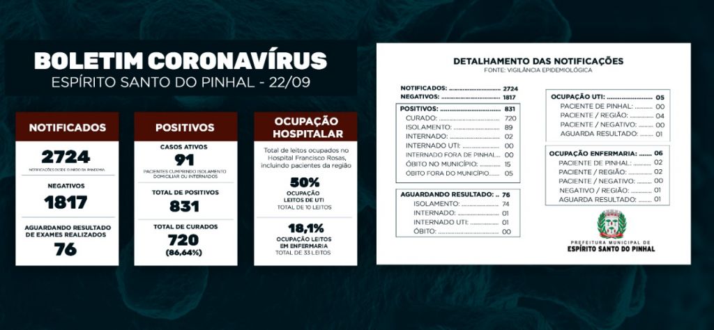 Nesta terça-feira, 22, a ocupação da enfermaria está em 18,1% e a UTI está em 50%. A Vigilância Epidemiológica recebeu os resultados de 35 exames negativos e 17 positivos. Atualmente são 91 casos ativos em Espírito Santo do Pinhal (pacientes positivos que estão cumprindo quarentena ou estão internados por conta da COVID-19). O índice de testagem atingiu a marca de 61,44 para cada mil habitantes, uma das maiores médias de toda a região.