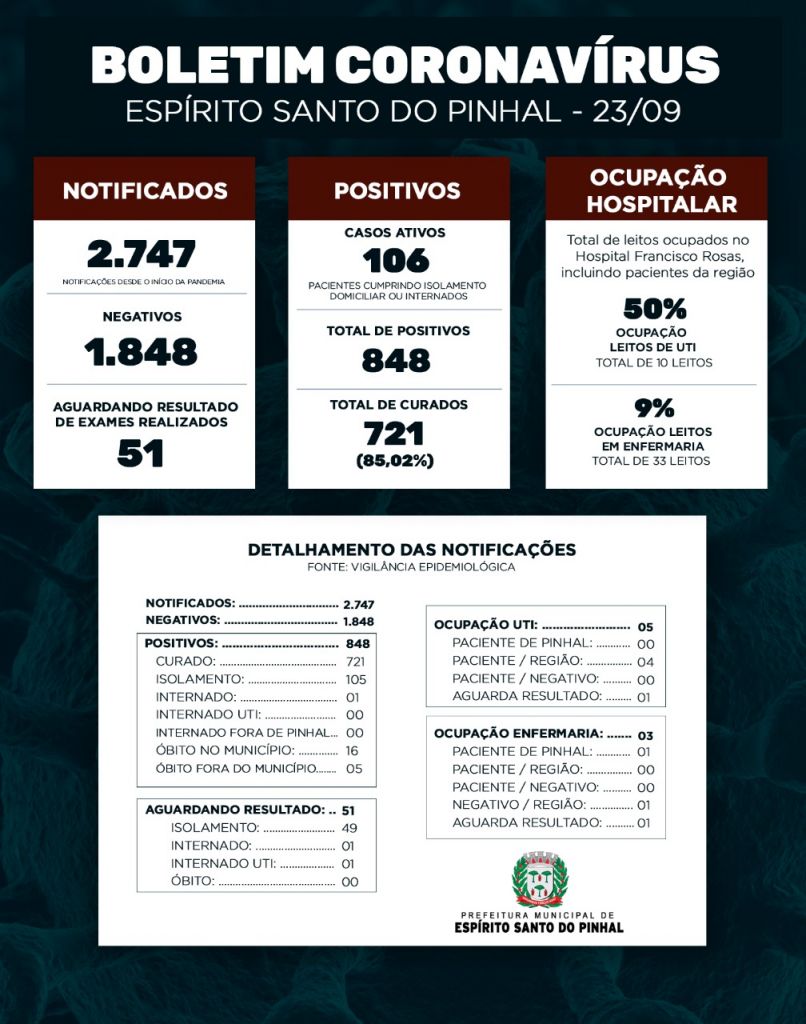 Nesta quarta-feira, 23, a ocupação da enfermaria está em 9% e a UTI está em 50%. O índice de testagem atingiu a marca de 61,96 para cada mil habitantes, uma das maiores médias de toda a região. Atualmente são 106 casos ativos em Espírito Santo do Pinhal (pacientes positivos que estão cumprindo quarentena ou estão internados por conta da COVID-19). A Vigilância Epidemiológica recebeu os resultados de 31 exames negativos e 17 positivos, sendo um óbito, que ocorreu no dia 21/09, de um paciente do sexo masculino, de 85 anos, que apresentava comorbidades. Neste momento de dor, a Prefeitura Municipal presta condolências à família, rogando a Deus que conforte o coração de todos.