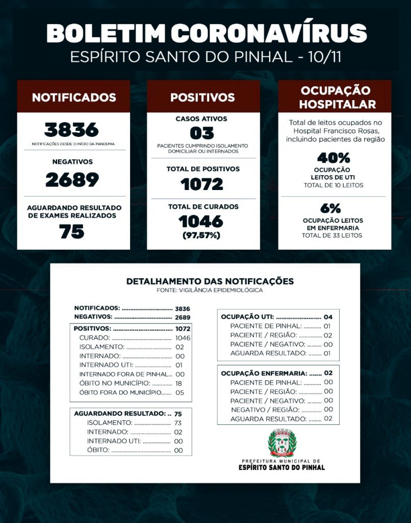Nesta terça-feira, 10, a Vigilância Epidemiológica recebeu o resultado de 6 exames negativos. A ocupação da UTI está em 40% e a Enfermaria em 6%. O percentual de curados está a 97,57% do total de positivos desde o início da pandemia. Atualmente são 03 casos ativos, o menor de ativos desde o início da divulgação, em Espírito Santo do Pinhal, que são pacientes que estão cumprindo quarentena ou estão internados por conta da COVID-19. O índice de testagem atingiu a marca de 86,53 para cada mil habitantes, uma das maiores médias de toda a região.