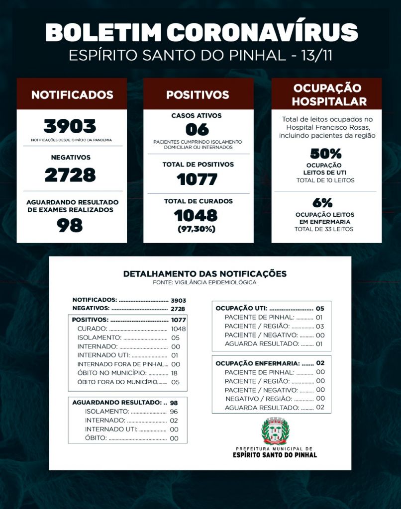Nesta sexta-feira, 13, a Vigilância Epidemiológica recebeu o resultado de 30 exames negativos e 4 positivos. A ocupação da UTI está em 50% e a Enfermaria em 6%. O percentual de curados está a 97,30% do total de positivos desde o início da pandemia. Atualmente são 06 casos ativos em Espírito Santo do Pinhal, que são pacientes que estão cumprindo quarentena ou estão internados por conta da COVID-19. O índice de testagem atingiu a marca de 88,04 para cada mil habitantes, uma das maiores médias de toda a região.