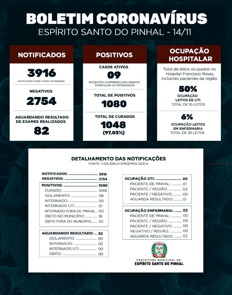 Neste sábado, 14, a Vigilância Epidemiológica recebeu o resultado de 26 exames negativos e 3 positivos. A ocupação da UTI está em 50% e a Enfermaria em 6%. O percentual de curados está a 97,03% do total de positivos desde o início da pandemia. Atualmente são 09 casos ativos em Espírito Santo do Pinhal, que são pacientes que estão cumprindo quarentena ou estão internados por conta da COVID-19. O índice de testagem atingiu a marca de 88,33 para cada mil habitantes, uma das maiores médias de toda a região.