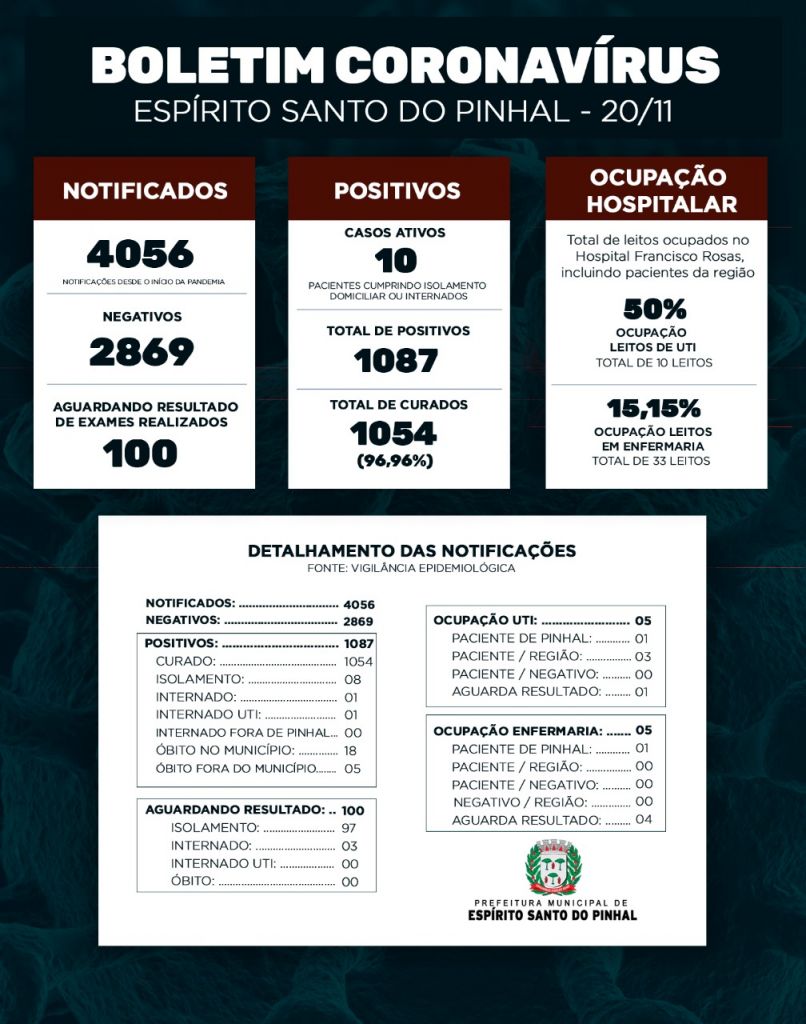 Nesta sexta-feira, 20, a Vigilância Epidemiológica recebeu o resultado de 30 exames negativos e 3 positivo. A ocupação da UTI está em 50% e a Enfermaria em 15,15%. O percentual de curados está a 96,96% do total de positivos desde o início da pandemia. Atualmente são 10 casos ativos em Espírito Santo do Pinhal, que são pacientes que estão cumprindo quarentena ou estão internados por conta da COVID-19. O índice de testagem atingiu a marca de 91,49 para cada mil habitantes, uma das maiores médias de toda a região.