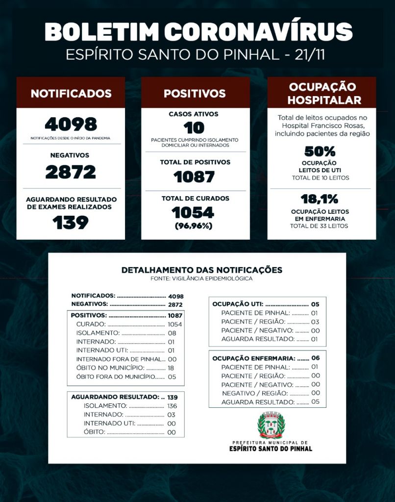 Neste sábado, 21, a Vigilância Epidemiológica recebeu o resultado de 3 exames negativos. A ocupação da UTI está em 50% e a Enfermaria em 18,1%. O percentual de curados está a 96,96% do total de positivos desde o início da pandemia. Atualmente são 10 casos ativos em Espírito Santo do Pinhal, que são pacientes que estão cumprindo quarentena ou estão internados por conta da COVID-19. O índice de testagem atingiu a marca de 92,44 para cada mil habitantes, uma das maiores médias de toda a região.