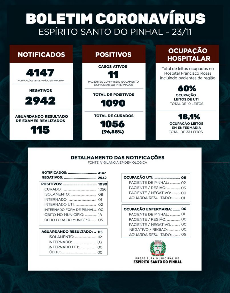 Nesta segunda-feira, 23, a Vigilância Epidemiológica recebeu o resultado de 63 exames negativos e 3 positivos. A ocupação da UTI está em 60% e a Enfermaria em 18,1%. O percentual de curados está a 96,88% do total de positivos desde o início da pandemia. Atualmente são 11 casos ativos em Espírito Santo do Pinhal, que são pacientes que estão cumprindo quarentena ou estão internados por conta da COVID-19. O índice de testagem atingiu a marca de 93,54 para cada mil habitantes, uma das maiores médias de toda a região.