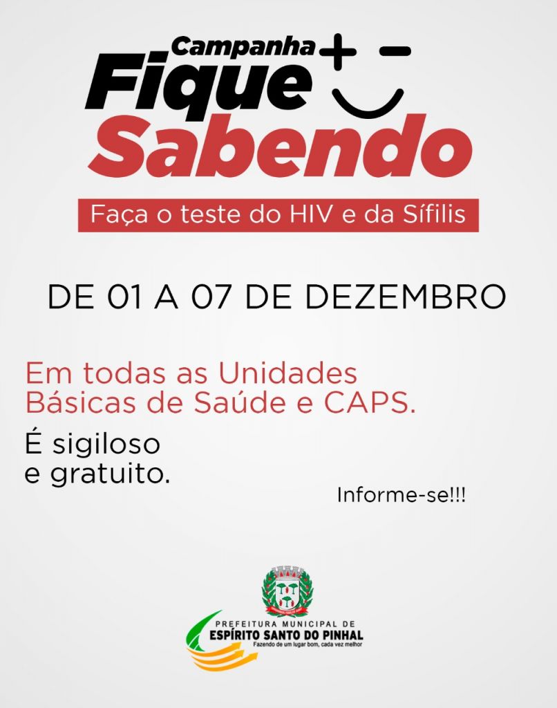 A Secretaria Municipal de Saúde de Espírito Santo do Pinhal iniciou hoje, dia 1º de dezembro, a Campanha “Fique Sabendo 2020”, que oferece, gratuitamente, testes de HIV e Sífilis. A data foi escolhida em comemoração ao “Dia Mundial de Luta Contra a Aids”.