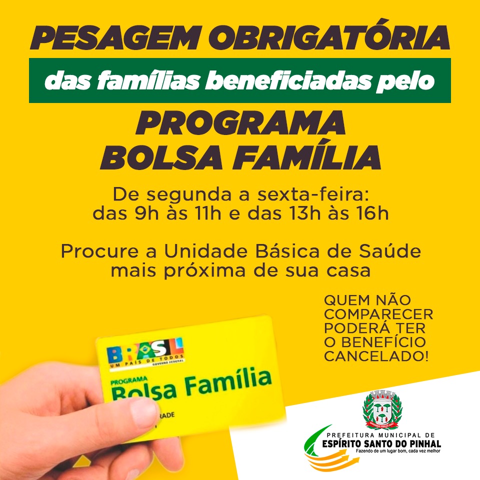 A Prefeitura de Espírito Santo do Pinhal informa aos pais e mães com filhos beneficiários do Bolsa Família que é necessário procurar a UBS mais próxima de sua residência para a realização da pesagem das crianças. A não atualização cadastral poderá acarretar com a suspensão do benefício.