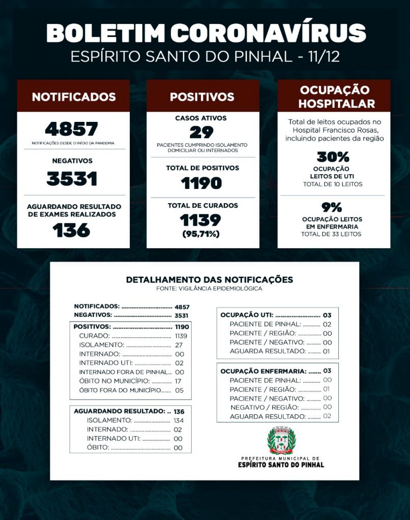 Nesta sexta-feira, 11, a Vigilância Epidemiológica recebeu o resultado de 21 exames negativos e 8 positivos. A ocupação da UTI está em 30% e a Enfermaria em 9%. O percentual de curados está a 95,71% do total de positivos desde o início da pandemia. Atualmente são 29 casos ativos em Espírito Santo do Pinhal, que são pacientes que estão cumprindo quarentena ou estão internados por conta da COVID-19. O índice de testagem atingiu a marca de 109,56 para cada mil habitantes, uma das maiores médias de toda a região.