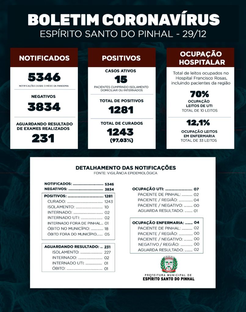 Nesta terça-feira, 29, a Vigilância Epidemiológica recebeu o resultado de 23 exames negativos e 5 positivos. A ocupação da UTI está em 70% e a Enfermaria em 12,1%. O percentual de curados está a 97,03% do total de positivos desde o início da pandemia. Atualmente são 15 casos ativos em Espírito Santo do Pinhal, que são pacientes que estão cumprindo quarentena ou estão internados por conta da COVID-19. O índice de testagem atingiu a marca de 120,59 para cada mil habitantes, uma das maiores médias de toda a região.