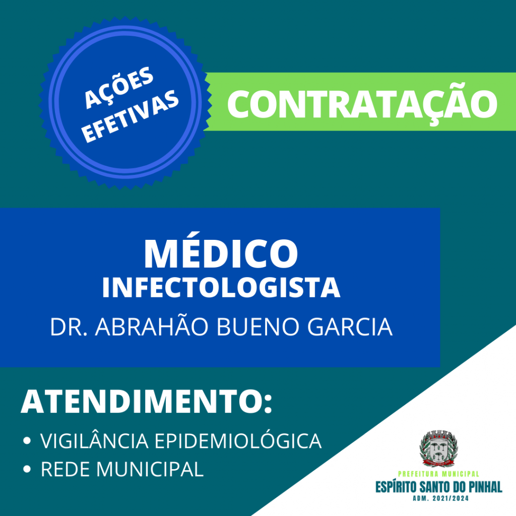 A Prefeitura Municipal através da Secretaria de Saúde, realizou a contratação de um Médico Infectologista para atuar junto a Vigilância Epidemiológica e também na rede municipal de Saúde no combate ao Coronavírus.