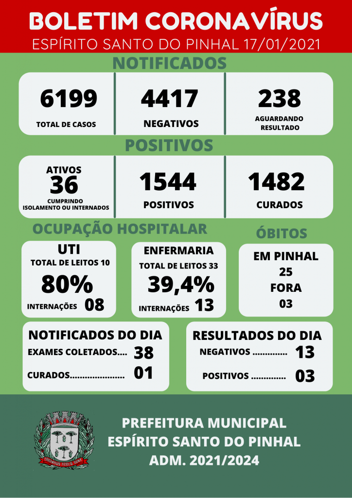 Enfermaria está com 13 Leitos ocupados, total de 36,4%, sendo 12 de Pinhal e 1 de outro município.