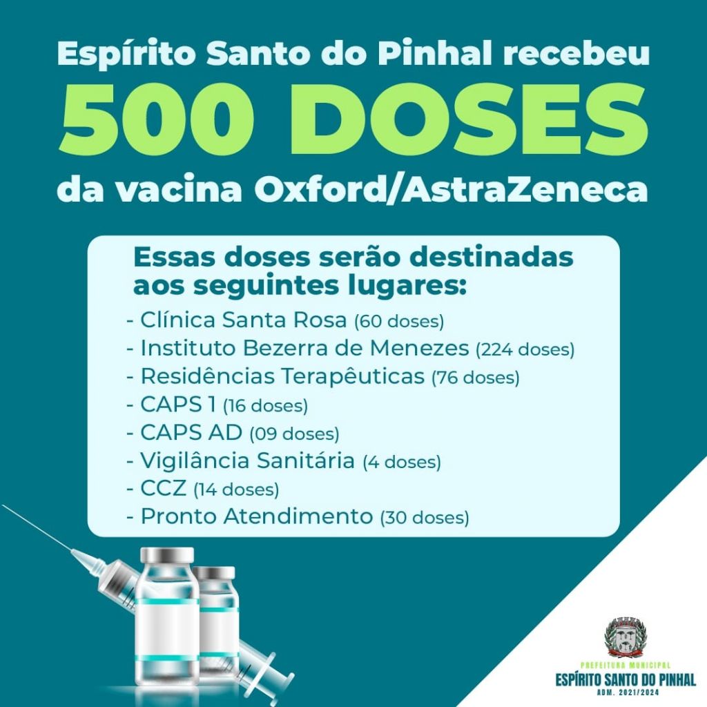 Nesta Quarta-Feira (27), Espírito Santo do Pinhal foi contemplada com 500 doses da vacina Oxford/AstraZeneca, enviadas pelo Ministério da Saúde. Uma grande conquista para nossa cidade!