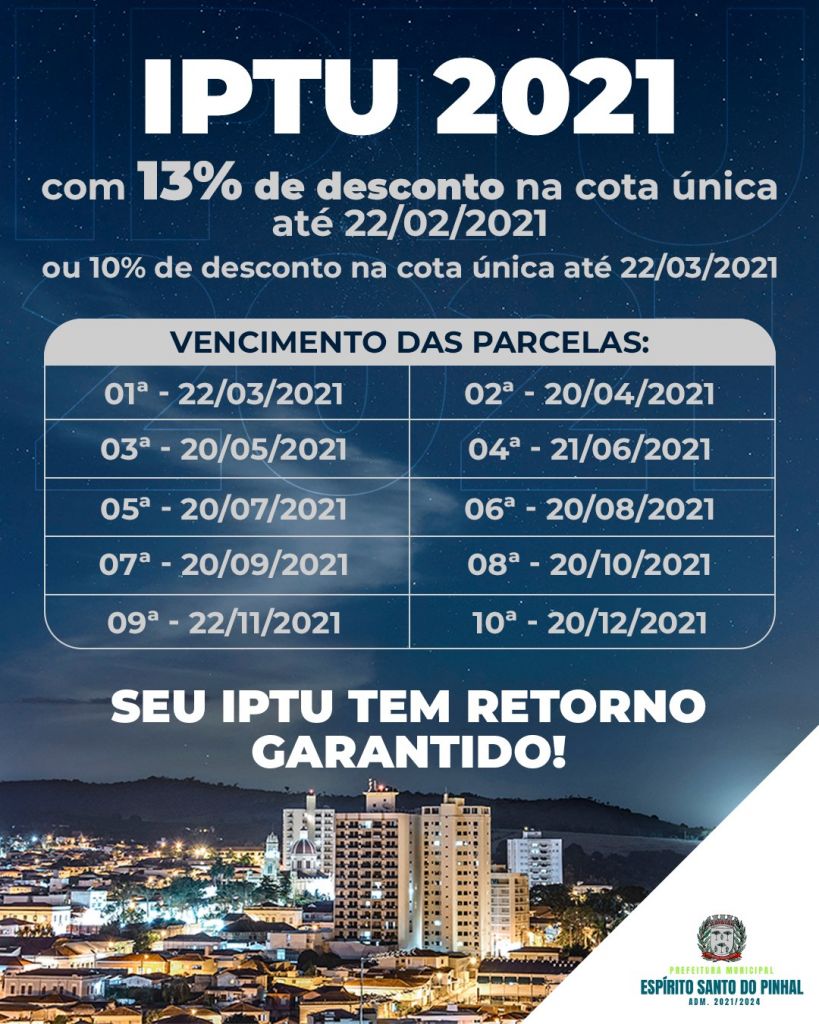 Para contribuintes que efetuarem o pagamento em cota única até 22/02, há um desconto de 13% no valor do imposto. Já para os que efetuarem o pagamento em cota única até 22/03, há um desconto de 10% no valor do imposto, lembrando que sob a taxa de coleta e remoção do lixo não há desconto, conforme Legislação Municipal.