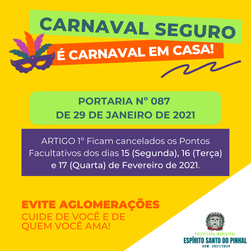 Levando em conta o crítico momento em que vivemos no combate ao coronavírus, a Administração Municipal cancelou os Pontos Facultativos dos dias 15 (Segunda), 16 (Terça) e 17 (Quarta) de Fevereiro de 2021.
