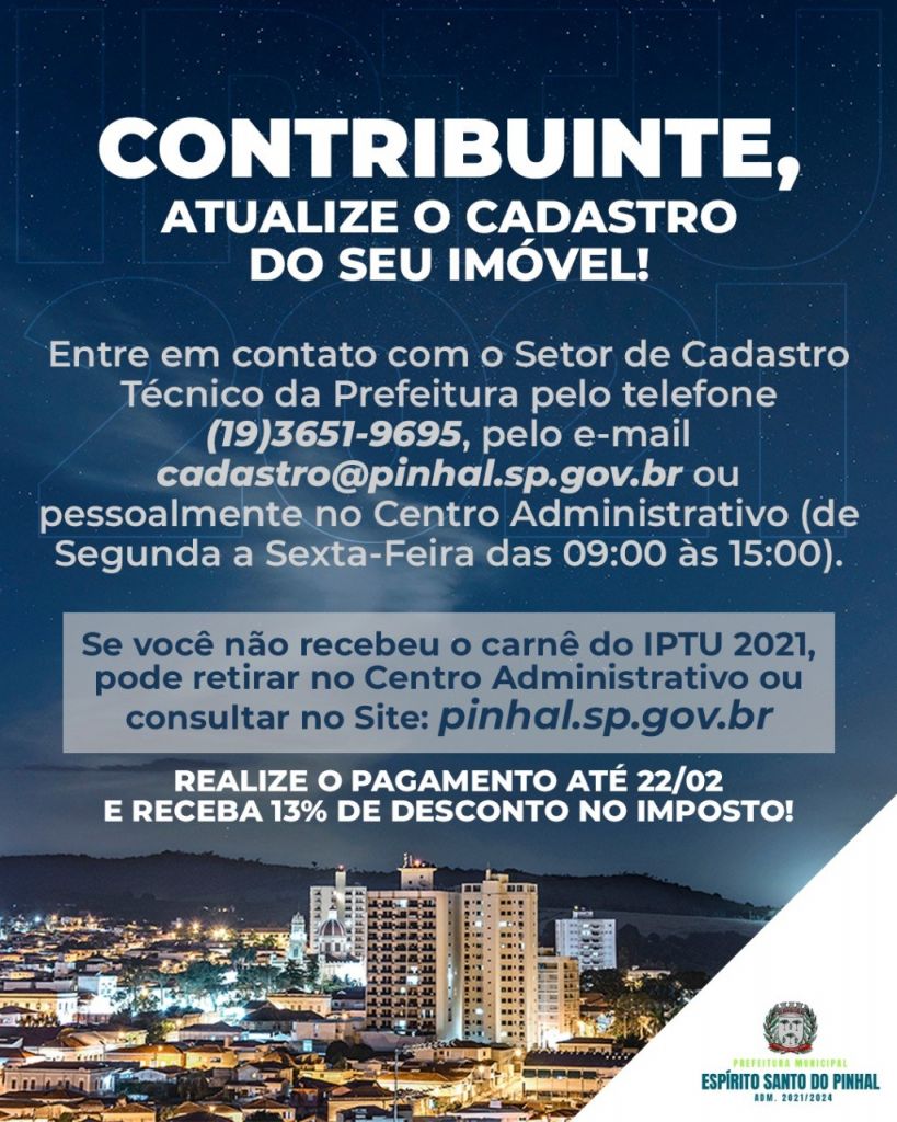 Se você não recebeu o carnê do IPTU 2021, pode efetuar a retirada no Setor de Tributação ou consultar no site: pinhal.sp.gov.br.
