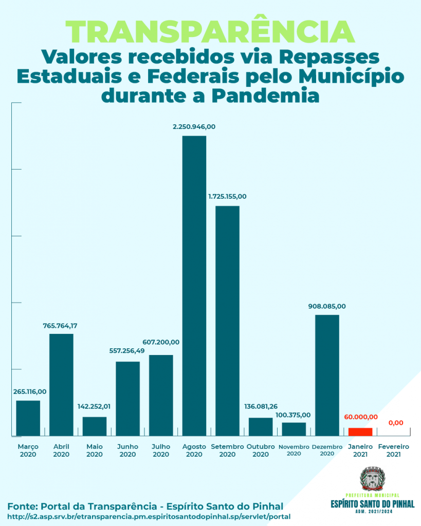Em 2021, nosso município recebeu apenas R$60.000,00 do Governo Federal para ações de combate e enfrentamento à COVID-19 e ainda não há previsão de mais verbas para o município. Em 2020, esse valor foi muito maior. Foram R$7.458.230,93 recebidos em repasses do Governo Federal e Estadual para esse fim.