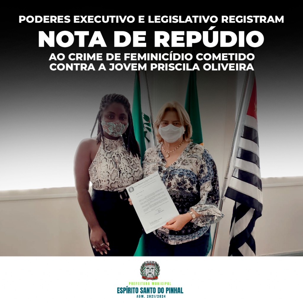 A Prefeitura Municipal de Espírito Santo do Pinhal e a Câmara Municipal, através da Vereadora Francine Félix, vem a público manifestar o mais profundo sentimento de repúdio ao crime de feminicídio que ceifou a vida de Priscila Oliveira.