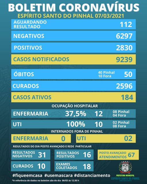 UTI está com 10 leitos ocupados no total de 100%,sendo 02 paciente de Pinhal e 8 de outros municípios.