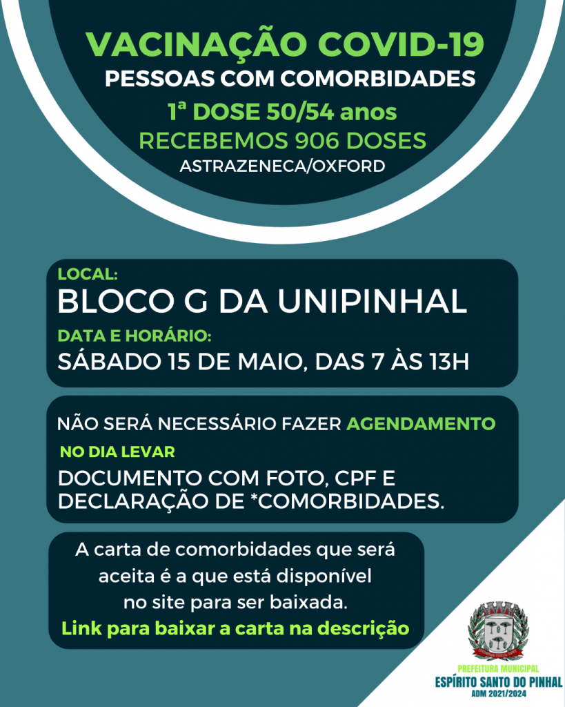 Neste próximo Sábado dia 15/05 serão vacinadas pessoas com comorbidades entre 50 e 54 anos.